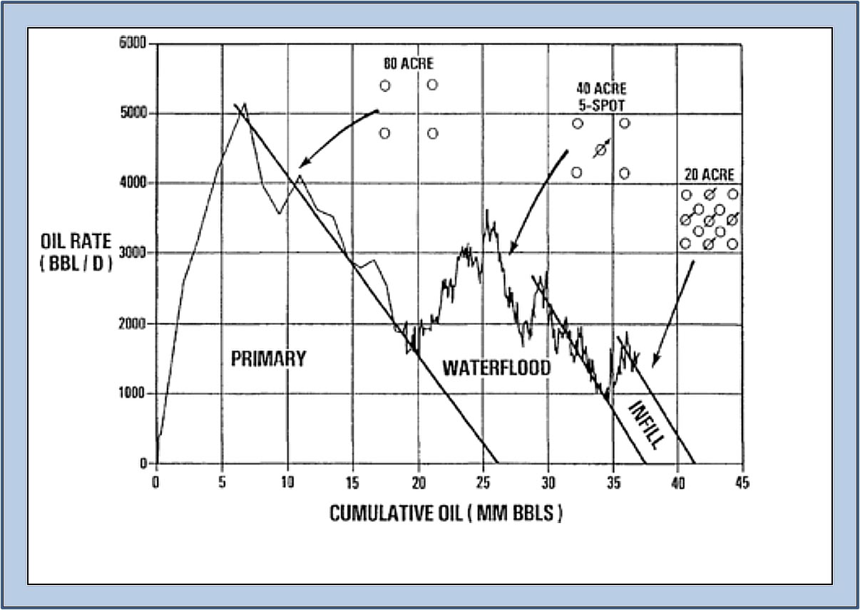 Each of the exceedance probabilities considers two components of a well's deliverability profile: the initial potential (IP) of the producer and the decline rate (Di) which is a constant for exponential fall-off. A summary well or type curve is developed (example right) which illustrates a technique for determining the performance parameters for the three probabilities. The production histories of five oil wells were tabulated and plotted to compare IP, Di, and cumulative oil in the analysis period. It is the total oil produced that exemplifies the capacity of the well to deliver oil, hence the highest cumulative is the P10 performance probability. Similarly, P90 is defined by the lowest total oil produced and the average well has the P50 cumulative oil. The risked deliverabilities become the basis for new well forecasts and reserves.