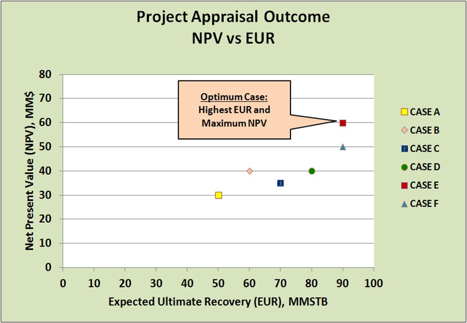 Economic Analysis The goal of economic analysis is to inform and support business decisions and reserve estimates. For some decisions, the answer is clear from an initial project overview. For others, much more detail is required. Most aspects of reservoir management involve economics - from acquisition through field development planning, consideration of secondary/enhanced recovery projects, evaluation of project effectiveness, production optimization, and finally divestiture. One aspect of economic analysis that sometimes seems counter-intuitive is that the lowest cost scenario does not necessarily generate the optimal solution. For example, a reduction in the cost structure to meet capital efficiency goals would tend to improve project economics and widen the scope of commerciality. However, optimization in a development plan with multiple scenarios is indicated by the case having the highest expected ultimate recovery (EUR) with the maximum positive net present value (NPV).