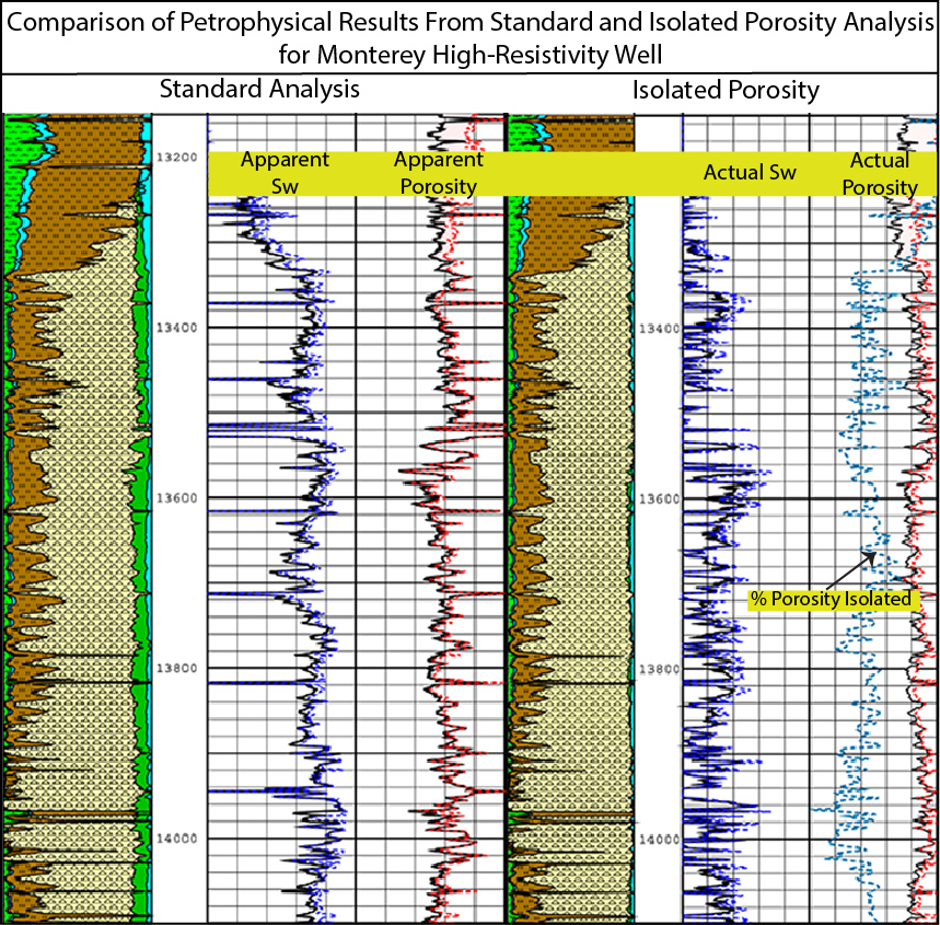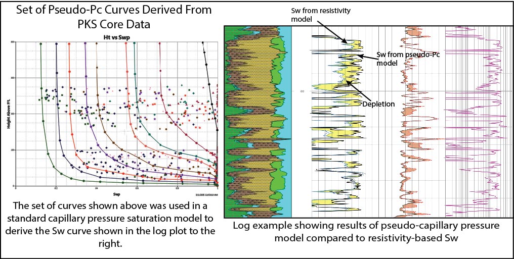 Current Research and Presentations We discover and resolve technical problems in almost every project, but for many of these client confidentiality prevents us from publishing the results. Results we can publish are summarized here, with links to more information. High-Resistivity Monterey Shales That May Not Be Pay Deriving Pseudo-Capillary Pressure Curves From PKS Data in Heavy Oil Reservoirs High-Resistivity Monterey Shales That May Not Be PayWe developed one of the first petrophysical models for siliceous Monterey shales that provided accurate reservoir properties, and have been improving this model for over 30 years. A particular highly siliceous facies in quartz phase is present in many areas of the San Joaquin Valley that is characterized by high resistivity and high log porosity. Our standard analysis model shows that these rocks contain significant hydrocarbons, yet mudlog shows and production responses sometimes are poor. After working with data from a number of wells and fields, we concluded that, in intervals with disappointing shows or tests, much of the porosity in the rocks is isolated from the fluid system, either by kerogen or diagenetic alteration. Recent research in Monterey rocks by others confirms this conclusion. We modified our Monterey model to account for the isolated porosity in calculating reservoir porosity and water saturation, and also to distinguish between zones that are likely to produce economically and those that probably will not. We presented our research on this topic at local section meetings and at the Pacific Section AAPG meeting in 2014.